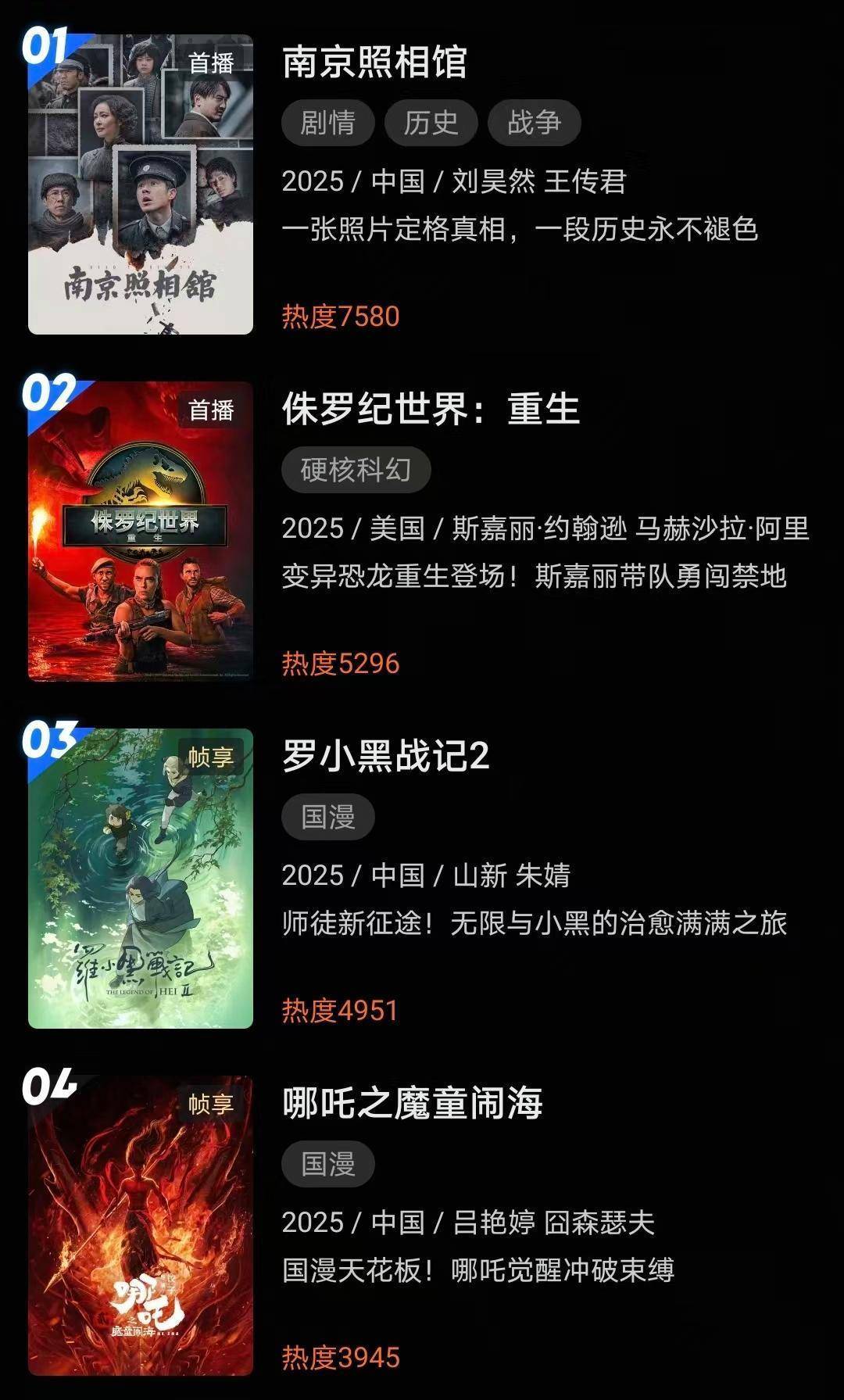 据国内的线上视频平台所显示,《南京照相馆》的热度值超过了7500,比《哪吒2》多出了近4000,成功拿下了热度冠军。