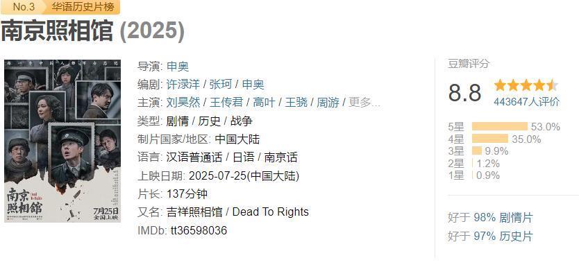 南京照相馆又火了力压哪吒2登顶 评分高达9.3分